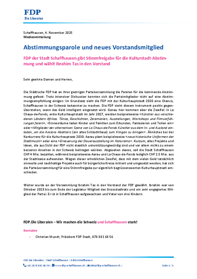 FDP der Stadt Schaffhausen gibt Stimmfreigabe für die Kulturstadt-Abstimmung und wählt Ibrahim Tas in den Vorstand
