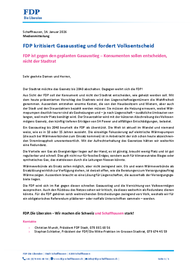 FDP ist gegen den geplanten Gasausstieg - Konsumenten sollen entscheiden, nicht der Stadtrat